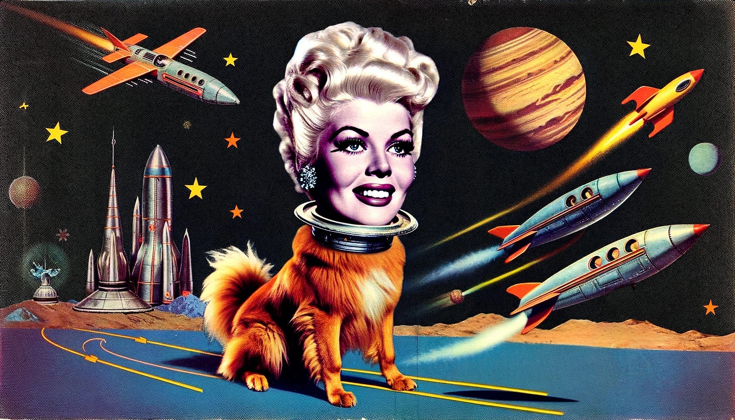 Like Ed stealing mismatched stock-footage to piece together for Plan 9 from Outer Space, with no budget we can stick Jayne Mansfield’s head on Lassie the Wonder Dog and send her tottering through space on new adventures.